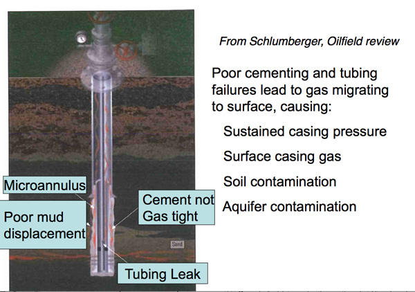 | I have been making most of these points about the problems of well case integrity from the outset of the campaign based on my own knowledge of first principles and the evidence of experts like Prof Tony Ingraffea. Here we have Karlis Muehlenbachs, a geochemist and a leading authority on identifying the unique carbon fingerprint or isotopes of shale and conventional gases, at the University of Alberta, expanding on these points based his own research and U.S. Federal studies: http://thetyee.ca/News/2011/12/19/Fracking-Contamination/ The findings, which clearly contradict industry assurances, didn’t surprise Muehlenbachs, who has studied leaking wells in Alberta’s heavy oil fields for decades. “The shale gas boom combined with hydraulic fracking will cause wellbores to leak more often than run-of-the-mill conventional wells,” says Muehlenbachs. “The problem is going to get worse, not better.” Muehlenbachs, who has been fingerprinting leaking gases since 1994, says that hydraulic fracking, which as we know, injects water, chemicals and sand into rock formations at high pressures, may create more leaks in wellbores overtime. (As industry searches for deeper and more extreme hydrocarbons, it must blast open tight rocks with more brute force over larger land bases than conventional operations.) According to Schlumberger, the world’s largest oilfield company, there are problems galore. In 2003, the company reported that 43 per cent of 6,692 offshore wells tested in the Gulf of Mexico by U.S. Regulators were found to be leaking. In fact, by the time a well gets 15 years old, there is a 50/50 probability it will leak significantly and therefore contaminate other zones, wells, or groundwater. “That’s amazing. It’s not Greenpeace reporting this but Schlumberger in the Oilfield Review,” says Muehlenbachs. (Reliable data on well integrity – see below – is hard to find, but a University of Calgary study found that in Alberta approximately five per cent of all wells leak, while leakage rates in Norway range from 13 to 19 per cent from producing wells.) The University of Calgary study on ‘Well Design and Well Integrity’ can be found here: http://www.ucalgary.ca/wasp/Well%20Integrity%20Analysis.pdf Muehlenbachs also recognises the industry’s propensity to tell blatant lies. Although petroleum engineers now admit that companies routinely blast fluids and gas into other industry wells hundreds of metres away (B.C., Texas and North Dakota have all documented such cases), they still claim that “fracture communication incidents” can’t happen with groundwater. Muehlenbachs, who has documented numerous cases of groundwater contamination, calls such denials dishonest. “Such claims do more harm than good to industry. Don’t they realize that social license matters to industry?” Whenever methane leaks from one well into a neighboring wellsite, “industry says let’s fix the leaks,” says Muehlenbachs. “But as soon as the leaks enter groundwater, everyone abandons the same logic and technology and says it can’t happen and the denials come out. In Alberta, it’s almost a religious belief that gas leaks can’t contaminate groundwater.” Yet it happens routinely. At a conference in Washington D.C. last month sponsored by ‘Resources for the Future’, Muehlenbachs showed evidence that shale gas drilling activity in Quebec and Pennsylvania had in several cases resulted in surface contamination. The debate about whether leaking shale methane comes from heavily fracked zones creating faults into groundwater or along poorly cemented wellbores is immaterial to landowners, says Muehlenbachs. “You don’t care if it comes from fracking or a bad cement job, you suffer the consequences all the same, and lose your well water.” Given these findings and a Duke University study that found extensive methane contamination of domestic water wells in a heavily fracked area, Muehlenbachs recommends that regulators do rigorous gas and water testing. In addition to baseline isotope testing of methane for all water wells and groundwater sources, Muehlenbachs says regulators must also test for ethane and propane (the shale gas fingerprint) as well as gas from abandoned wells and natural seeps and gases from well casings. This is certainly is not part of our Environment Agencies regime of testing at present. FOOTNOTE – Courtesy of Will Cottrell: For the record, the audio for the event you mention is at http://video.rff.org:8000/~rff/111411.mp3, while Muehlenbachs’ slides are here – http://www.rff.org/Documents/Events/Seminars/111114_Managing_the_Risks_of_Shale_Gas/Muehlenbachs%20Nov%2014%20FINAL.pdf