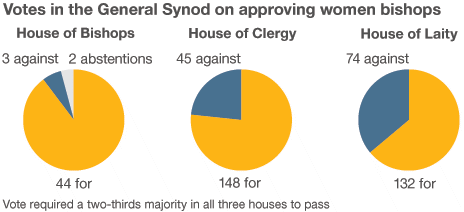 | The Church of England (see footnote on Church in Wales situation) has really shot itself in the foot with its farcical constitution allowing a small minority of old-fashioned bigots to hold the Church back from a modicum of progressive change.It is a system that was put in place to protect the churchs traditional values at a time when these were accepted unquestioningly by the majority.While 324 synod members voted for women bishops, Church voting rules mean 122 votes against were enough to block it.