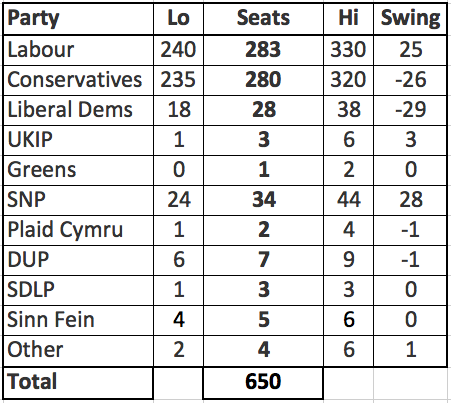 Firstly, only the most extreme figures allow for any party (Labour) to have an absolute majority. It is strongly odds-on that we will have a hung parliament.