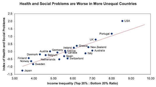 Evidence shows that a major contribution to serious emotional distress is not only poverty but particularly income inequality – the growing gap between the richest and poorest people in society. In their influential book The Spirit Level, sociologists Richard Wilkinson and Kate Pickett demonstrate that mental health problems are highest in those countries with the greatest gaps between rich and poor, and lowest in countries with smaller differences. Equal societies are associated with more trust and less paranoia. This suggests that rather than primarily targeting our efforts at individuals, the most effective way to reduce rates of ‘mental illness’ might well be to reduce inequality in society.