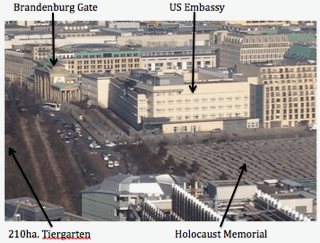 This is looking due north towards the Brandenburg Gate. Built in the 18th Century as a monumental gateway to the Prussian monarchs’ palace, it survived two world wars to then find itself just on the east side of the Wall that ran up the road from Potsdamer Platz, with Tiergarten Park on the west side of the wall. The wooded parkland extends for 210 hectares (520 acres). Originally part of royal hunting grounds, they were completely stripped of all trees towards the end and after WWII as the Berliners desperately needed firewood to survive the bitter winters. The cleared land ended up as vegetable allotments as they fended off starvation too. The trees are back today, largely replanted by Berlin residents apparently, but it still comes as a surprise to learn that none of the trees there are much more than 60 years old. The area to the east of the road/wall was once the fortified communist-imposed Death Strip. That it now has the Holocaust Memorial and huge US Embassy on it, side by side, seemed appropriate and disconcerting in equal measure. Just off picture in the Tiergarten (in the old West Berlin) are much smaller individual memorials to other groups targetted by the Nazis: homosexuals, Sinti & Roma, Russians.
