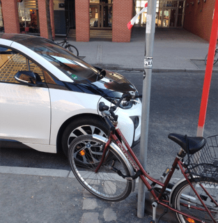 Here we have the double line of cobbles crossing a footpath and road before disappearing for 30m or so under a new office block. Parked across it is, facing east, a woman’s bicycle; facing west, a brand new BMW i3 electric car on a free charging point. Two very different perspectives on sustainable transport staring at each other across an entrenched divide.