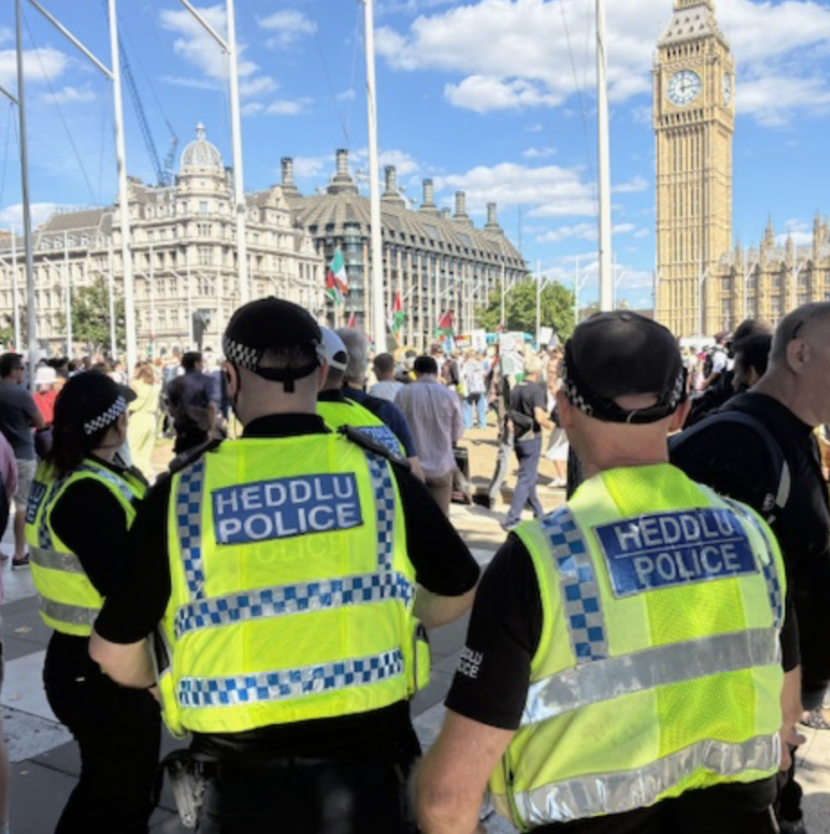 I wandered around the cordon until I stumbled across a whole section, in front of the Nelson Mandela and Mahatma Gandhi statues, ironically enough, that consisted of officers from Wales! They were very conspicuous due to the HEDDLU labels, but also much chattier (would you believe that!). Chatting to a few of them, I clarified that my placard would likely not get me arrested today as it is ambiguous enough as to whether I was expressing support for Palestine Action, and they had plenty of unambiguous ones to sort out first. I asked her if I verbally removed the ambiguity and told her I supported Palestine Action, would she arrest me. She said that that still would not be a priority today. Oh well, I tried!