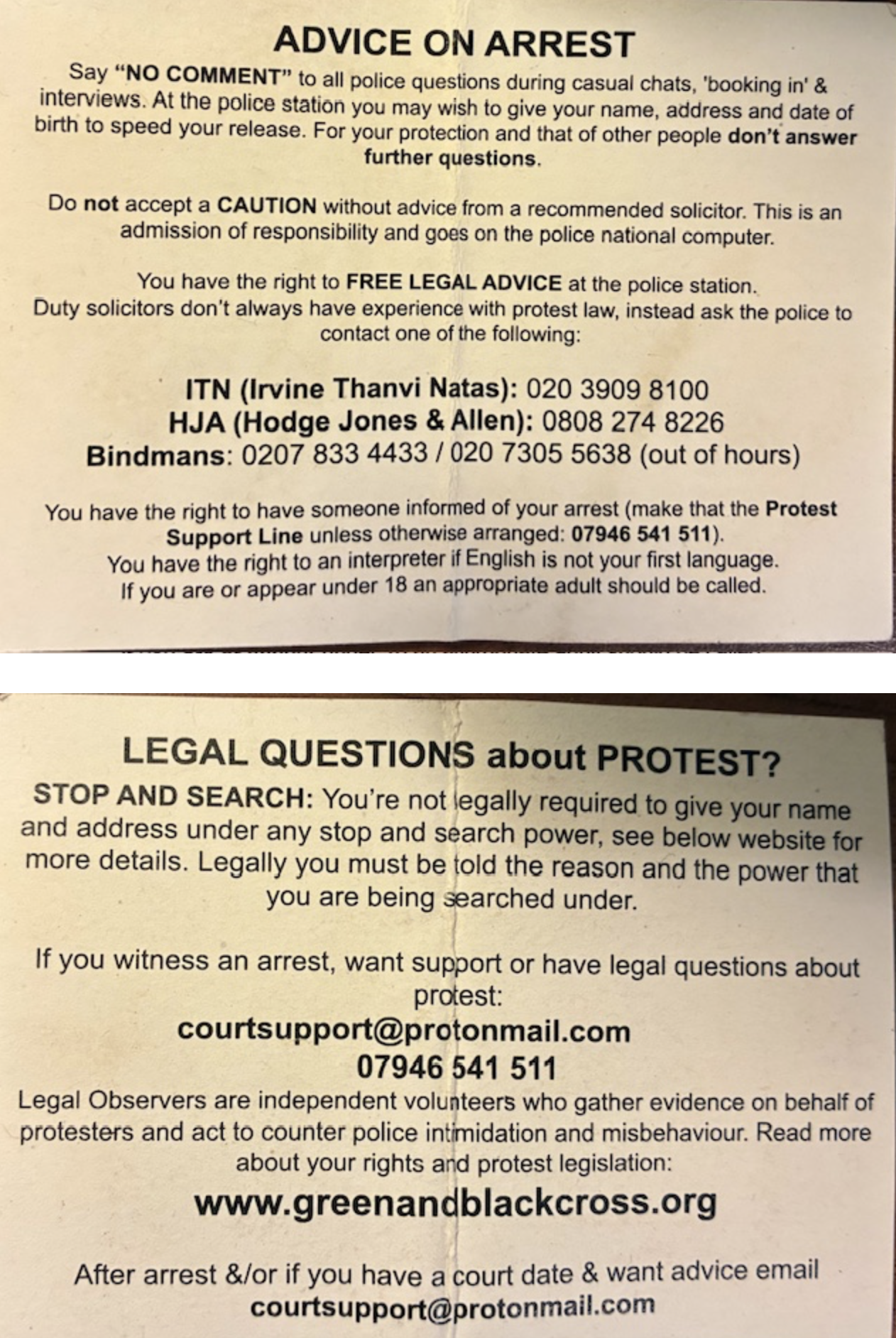 The legal advice around being arrested has been the same for years. Below is an up-to-date copy of the cards the legal observers hand out on demos. The only thing that has changed is the phone numbers and email addresses, so if, like me, you have been carrying one of these in your wallet/purse for years, you might want to check you have the current contact details.