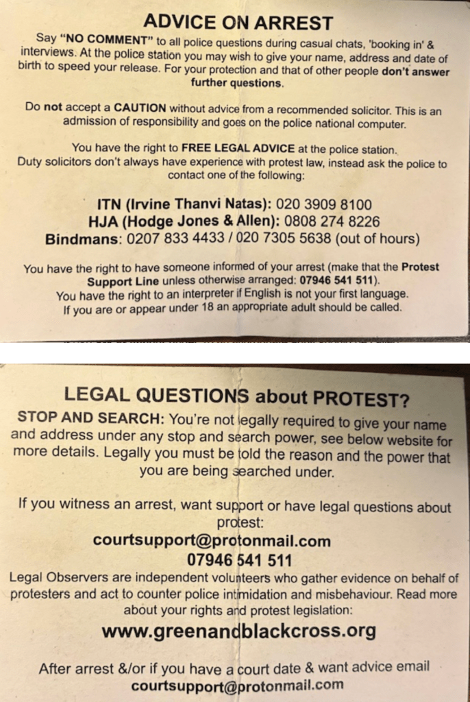 I’m sure all of those arrested in Parliament Square today will have had them. Because of the consequences outlined above, the 500 volunteers will have all known the possible consequences and how to handle the near-inevitable arrest. Perhaps because of this, the demographics of these 500 people are a bit different to most people I have seen arrested at demos over the years.