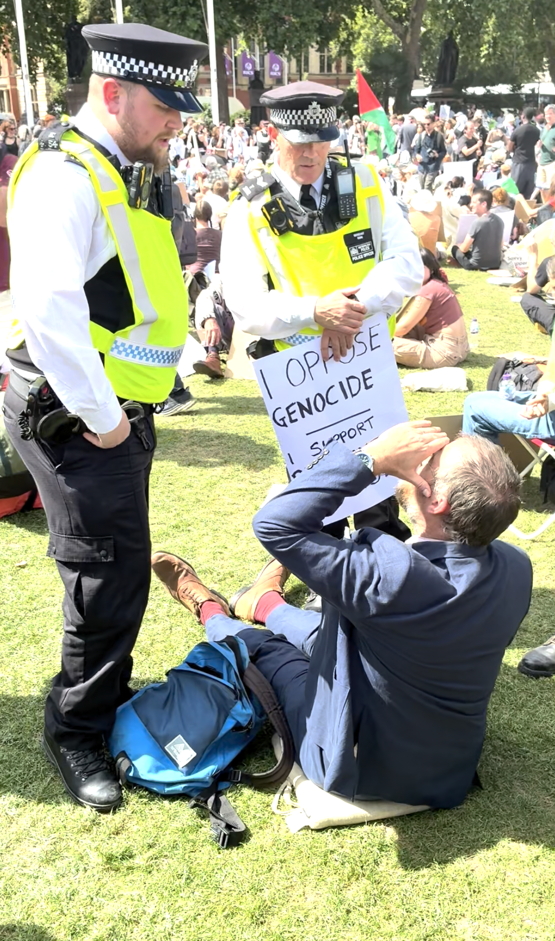 Just to lighten the mood a tad, let me share two true stories from today of arrests that made me chuckle. These were not in Westminster Square but on the National March. These were people whose placards were deemed less ambiguous than mine in their support for Palestine Action. Both were dismissed when taken for processing with the arresting officers rebuked for their illiteracy, I warrant. The first went something like this:
