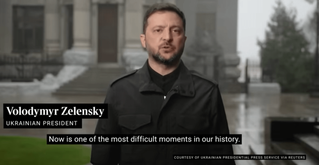 Zelenskyy addressed the nation, saying Ukraine was faced with a choice of “losing our dignity or the risk of losing our key partner”. He spoke of an extremely difficult week ahead, and of unbearable pressure being put on Kyiv.